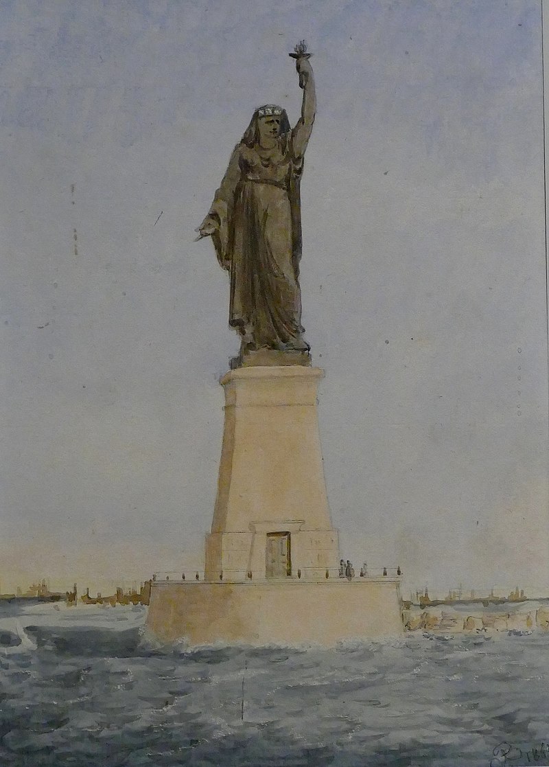 Η μορφή που είχε στο μυαλό του θύμιζε έντονα το μετέπειτα Άγαλμα της Ελευθερίας: μια γυναικεία φιγούρα με υψωμένο χέρι που κρατούσε έναν πυρσό. Μάλιστα, το αρχικό όνομα του έργου ήταν «Η Αίγυπτος που Φωτίζει την Ανατολή». Το άγαλμα θα είχε ύψος 30 μέτρα και θα απεικόνιζε μια αγρότισσα με παραδοσιακή ενδυμασία και μαντίλι στο κεφάλι.
